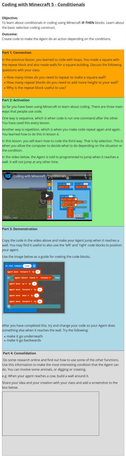 Coding with Minecraft 5 - Conditionals is part 5 of 6 of the Coding with Minecraft series. This introduces the concept of conditionals and teaches student how to use the IF-THEN blocks in coding.