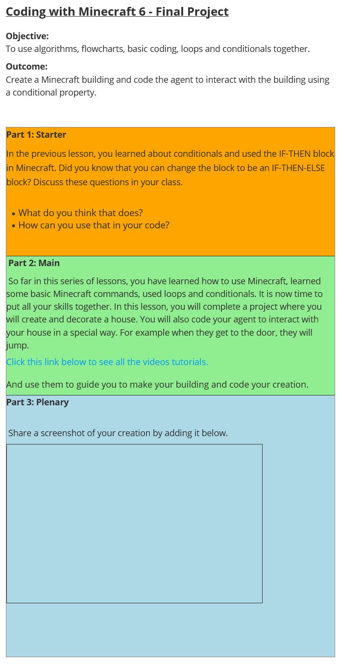 Coding with Minecraft 6 - Basic Coding is part 6 of 6 of the Coding with Minecraft series. This lesson teaches attempts to combine all that students have learned in the series to create a final project. Students will create a building that they will decorate and will code the Minecraft Agent to carry out a conditional action related to their building.