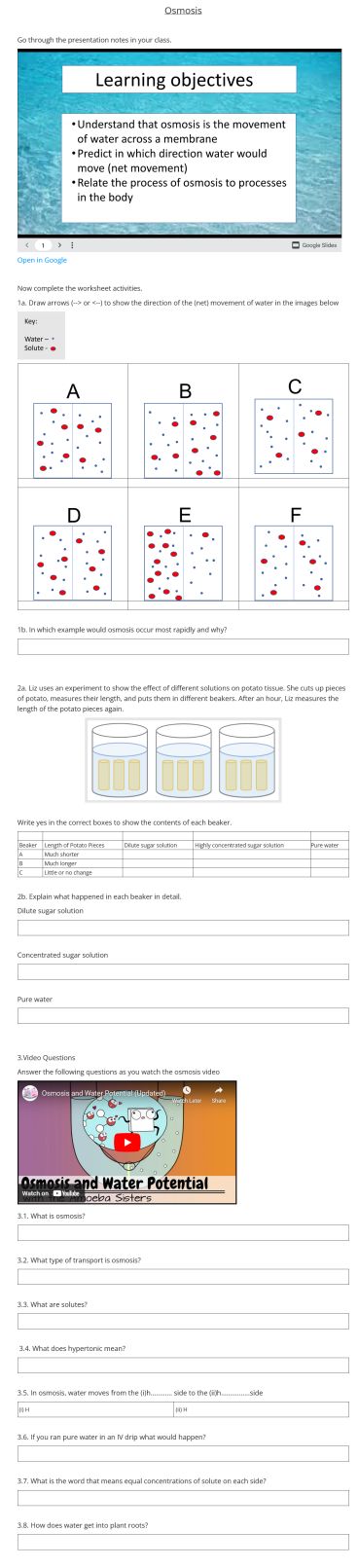 Used as an introduction to osmosis for a high ability year 9 group - but can be tweaked for lower ability and revision. Used as a freestanding lesson before attempting the AQA required practical on osmosis. Lesson contains a 10 minute video by the wonderful 'Amoeba Sisters'.